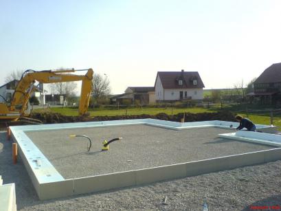 Erstellen des Kiesbettes und Verlegen der Leerrohre für Medien (Telefon, Gas, Strom etc.), der Abwasserleitungen, des Potentialausgleichs und der Frostschürze
